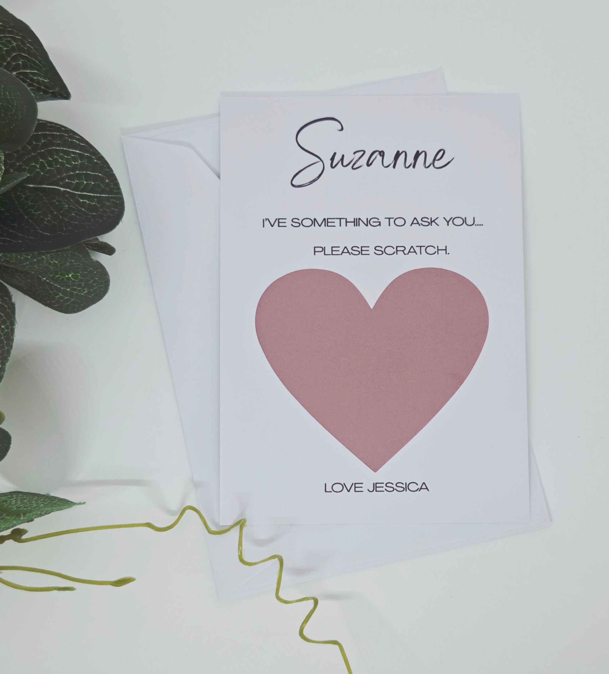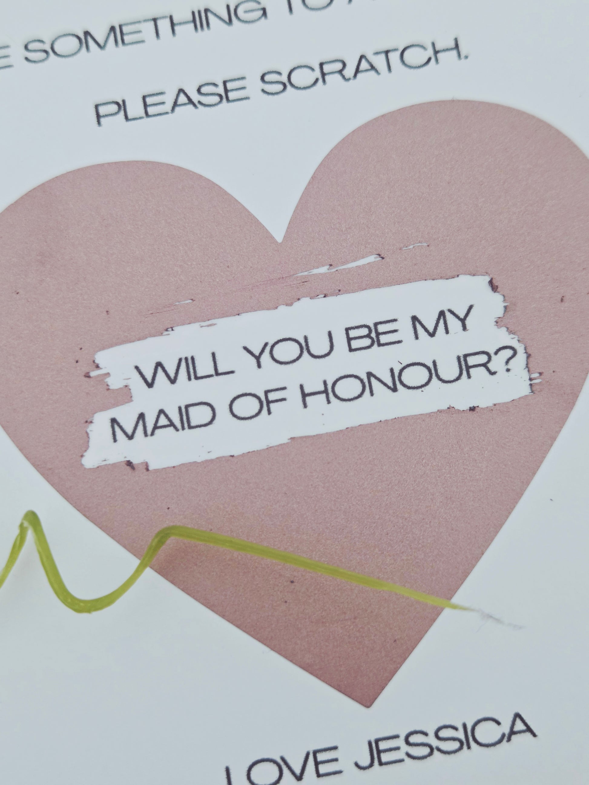 Each card is A6 in size and comes complete with an envelope and personalised with the recipients name and their proposed role which is hidden under either a gold or rose gold heart shaped scratch panel.