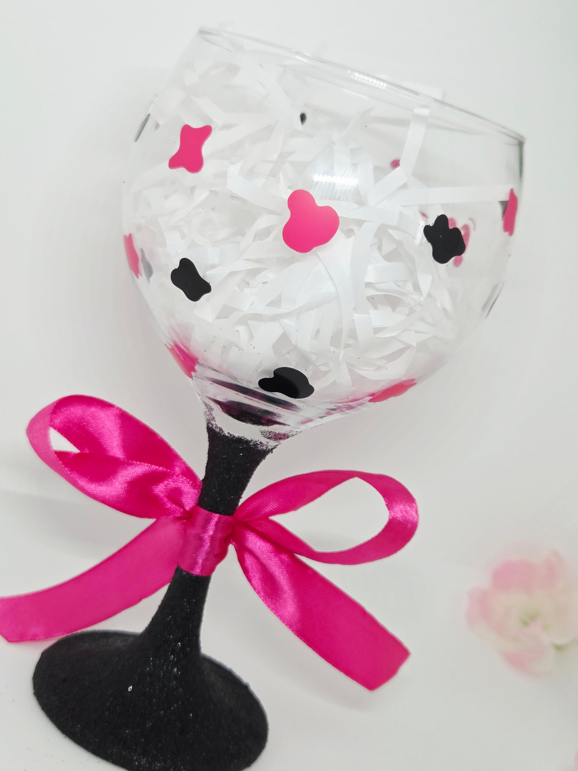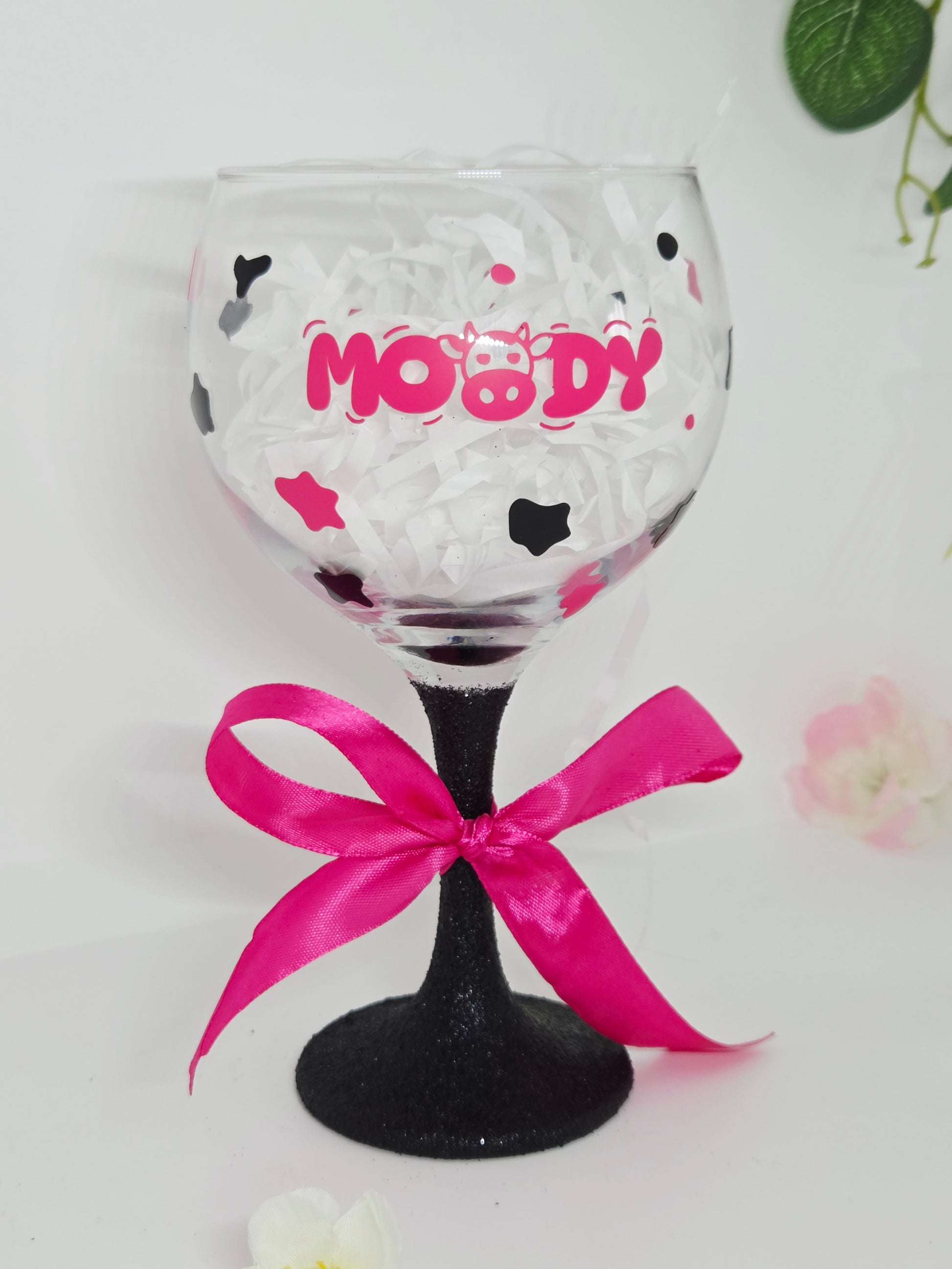 This cheeky Moody Cow design glass is a brilliant gift for any celebration. Featuring a black glitter stem that’s double coated for vibrant colour and sealed to stop glitter from shedding on your hands, clothes, or furniture. The bold black and pink combo pops, topped off with a cute hand-tied ribbon for extra charm.